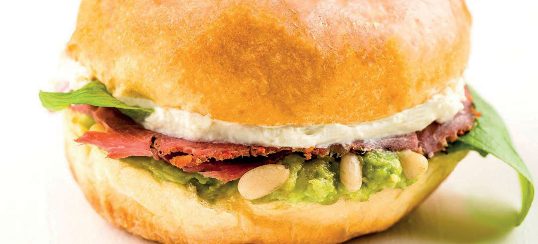 Tartiner une partie de la briochette de fromage frais et l'autre de la chair d'avocat préalablement écrasée, disposer une tranche de pastrami puis une feuille de salade.