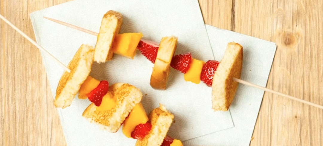 Enfilez les morceaux de brioche et de fruits en les alternant sur des brochettes en bois.